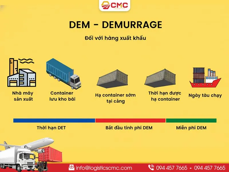 DEM được viết tắt của từ Demurrage. Trong ngành vận tải biển và Logistics, phí DEM là phí lưu container tại cảng (hoặc bãi) mà hãng tàu thu từ khách hàng (người xuất khẩu hoặc người nhập khẩu).