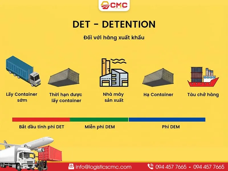 DET được viết tắt của từ Detention. Đây là phí lưu container tại kho riêng của khách hàng hoặc phí giữ container ngoài cảng.